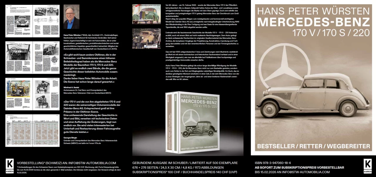 Mitte Februar 2026 – genau zum 90-jährigen Jubiläum der Präsentation des Mercedes-Benz 170 V auf der Internationalen Automobil- und Motorrad-Ausstellung Berlin 1936 – geht nun das umfangreiche zweibändige Werk über die Mercedes-Benz 170 V, 170 S und 220 (W 187) im Buchhandel in den Verkauf. Es ist das Ergebnis umfassender Recherchen in den historischen Quellen des Daimler-Benz-Archivs und einer intensiven, mehr als zehnjährigen Arbeit.